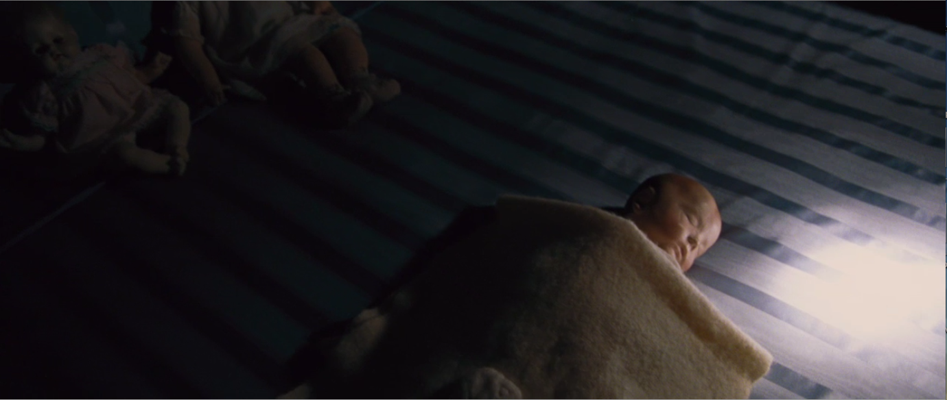 Her house, if it is her house, suggests remnants of the past she cannot bear to leave behind. A doll in a bed with a blanket pulled up to its chin. Pulled shades. Dark interior. She wanders like a specter.