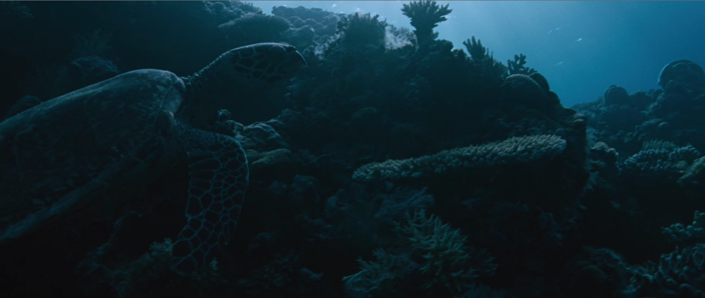 Sun shafts poke the blue depths of a sea. A Loggerhead Turtle combs the outskirts of a coral reef.