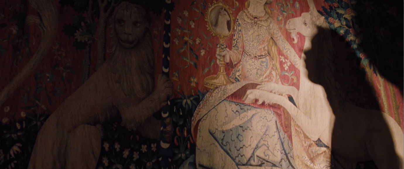 His Paris residency during his second marriage to Michele Morrete (and his troubled relations with his rebellious stepdaughter, Alexandra) in 1985 to 1998 served as the autobiographical backbone to this film. There are, again, a sense of fast and fleeting memories. We do not tend to remember every explicit moment of our past explicitly, but some of it through snatches of images and sound. Impressions are more telling than dialogue. Marina is entranced by all she sees. The couple visit the Cluny Museum where Marina’s shadow approaches one of a the series of ‘Lady of the Unicorn’ tapestries (each are dedicated to the five senses). The three seen in the film are sight; tactile (which Marina seems to be touching); and the last which is known by its inscription, “A Mon Seul Desir.” (pictured below and from the film is the tapestry in the series representing “sight”).
