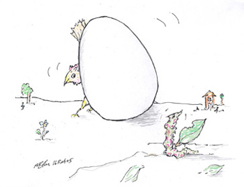 | One time a caterpillar, who happened to look up from the leaf she was eating, saw a chicken laying an enormous egg. Since things in the distance always look smaller than things up close, from the caterpillar's vantage point it appeared to her that the egg was laying the chicken. This information was very comforting since her Uncle Fenimore, her mother's odd-ball brother, would always loudly call out at the sight of her, asking which came first, the chicken or the egg, and then squirm and wiggle with such high-strung silly laughter that it became a sore spot that got on the caterpillar's nerves to such an extent that she would develop an instant skin rash at the very sight of him. Now at last, having seen the egg laying the hen, she told Uncle Fenimore the answer as to which came first and finally put an end to all his irritating silliness. And he himself was so relieved that his little tick didn't tick her off anymore that he most graciously let her take a few small puffs on his hookah. Perhaps you've seen a picture of him sitting on a mushroom scolding Alice while puffing away.
