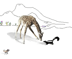 "S tripes may be interesting for some people," said the giraffe rather haughtily (as was her nature), "but when it gets down to brass tacks, having `spots' is the only way to travel!" "Hmmmm... .," said the skunk somewhat enigmatically; and that was all he said.The giraffe attempted to hide the fact that she had been terribly unnerved and up to her neck with embarrassment by the laconic, understated position that the skunk had taken by proceeding to pummel the skunk with even more heightened, high-handed affectation, pretentiously continuing to ramble on and on about the classic and well-founded position that she was sallying forth with regarding the superiority of spots over stripes. But they both knew that a single word (or rather sound, since "Hmmmm... .," can hardly be called a word), had pierced her arrogant vanity to the quick. "This inane balderdash has a very hollow ring to it," thought the skunk, "I wonder if she's aware of what a jackass she's making of herself?" (He considered using "jillass" but rejected it as being too overly PC.) Twice, the skunk almost interrupted the giraffe to actually ask that question but each time he thought the better of it since the giraffe had a mean front hoof and often discretion is the better part of valor. After some time had passed, the giraffe realized (right in the middle of a brilliantly presented pontification of one of her cleverest and most salient points), that the skunk had completely fallen asleep and, without a moment's hesitation she gave the skunk such a mean whack with the sharpest part of her right hoof that it sent the skunk sprawling a good twenty yards. It took the poor skunk more than two months to heal but when he finally got on his feet again people said how marvelous it was that he had changed, that it was as if they were talking to a different person. Unbeknownst to them, during his convalescence the skunk had found a guru-healer who had enlightened him as to the downside and dangers of his taciturn nature and had patiently instructed him in the ways of a new movement coincidentally called "The valor of openness" or, as many Russians like to put it, "The sparkle of glasnost." Thus, whenever he had a wicked thought, he never held his tongue but let anyone who happened to be around have it right between the eyes; and when that didn't work, then he..., well, you know how skunks can be when you piss them off. His new candor and openness worked quite well for a while but one day when he least expected it, the skunk had a second face-to-face confrontation with the giraffe who, frankly, was still as obnoxious as ever. "This time," thought the skunk, "I'll be more open, pay more attention and stoically put up with her BS before I finally bop her." But the skunk's recently released new personality soon took hold like the tip of a chameleon's tongue to a wayward fly, and before he knew it, the skunk had blurted out something to the effect that although some people merely thought that the giraffe's head was up in the clouds, for the skunk's money, he was betting that it was up her ass. This observation didn't sit too well with the giraffe, and being in a nasty, prissy snit as she haughtily turned to leave, she let the skunk have it with a hind-hoof that knocked the poor skunk's head clear off. Moral: When it comes down to stinking your neck out or loosing your head, discretion is still the better part of valor. Editor's note: Sorry ladies, but only female giraffes have "G-spots," so it had to be you! © 2004__Muldoon Elder |